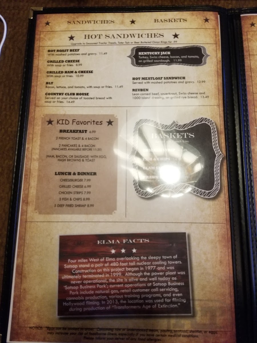 Throughout the day, the menu features a range of satisfying choices, from a well-crafted Patty Melt or Mushroom Swiss Burger to more traditional dinner specials such as Meatloaf, Homemade Lasagna, or the Doc Holiday Stack. For those who enjoy pub classics, there’s a solid selection of burgers and sandwiches, including the unique Yak burgers and the hearty Hot Roast Beef Sandwich. The inclusion of fresh veggies and salads rounds out the menu for lighter or balanced meals.